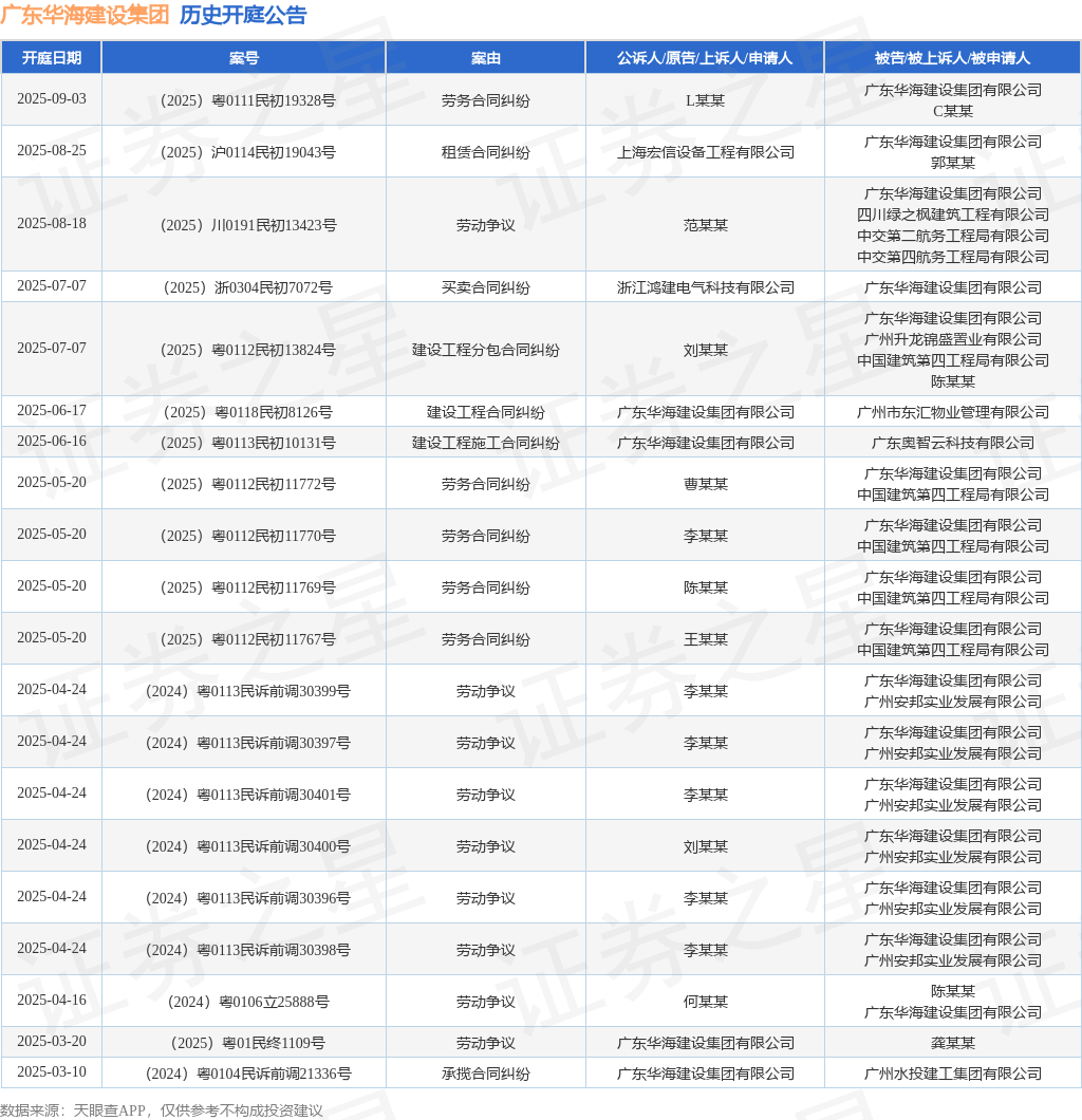 根据统计,近一年内以广东华海建设集团有限公司为当事人的历史开庭公告有36则,其中案由为“劳动争议”的公告以13则居首,其次为“买卖合同纠纷”有9则,“劳务合同纠纷”有5则。历史开庭公告(前20条)如下: