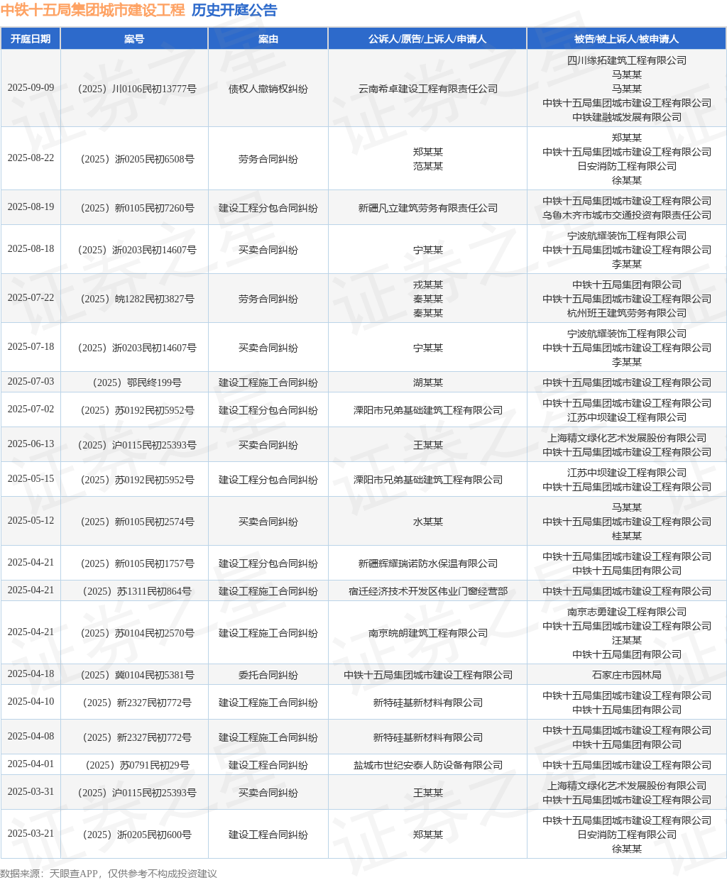 根据统计,近一年内以中铁十五局集团城市建设工程有限公司为当事人的历史开庭公告有50则,其中案由为“建设工程分包合同纠纷”的公告以12则居首,其次为“劳务合同纠纷”有10则,“建设工程施工合同纠纷”有9则。历史开庭公告(前20条)如下: